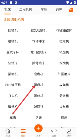 2、在分类里选择【机床】类别,接着在【金属切削机床】分类下找到【螺母机】并点击,即可进入螺母机的相关列表页面。