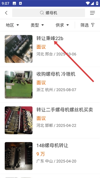 3、在螺母机列表里,挑选像【转让秉峰22b】这类设备条目,点击进入设备详情页。