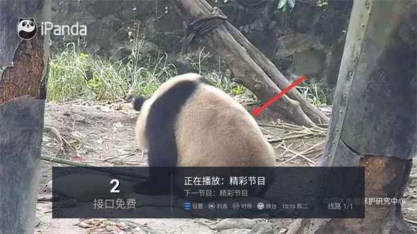 切换至目标频道后,即可观看该频道对应的节目内容,例如iPanda熊猫频道的熊猫相关节目,此时界面会呈现出节目播放的具体信息。
