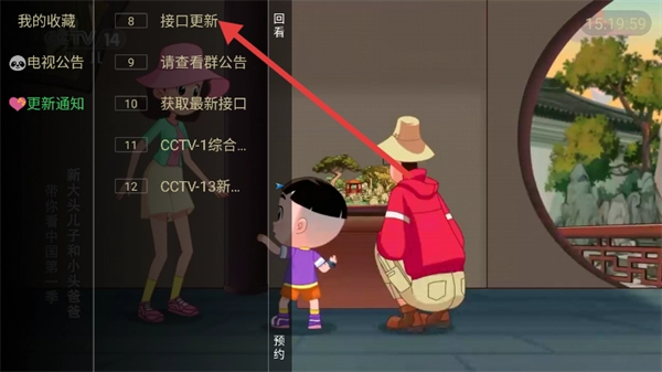 在电视播放界面,点击【换台】按钮后,会进入一个菜单页面,该页面包含【我的收藏】【电视公告】等选项。
