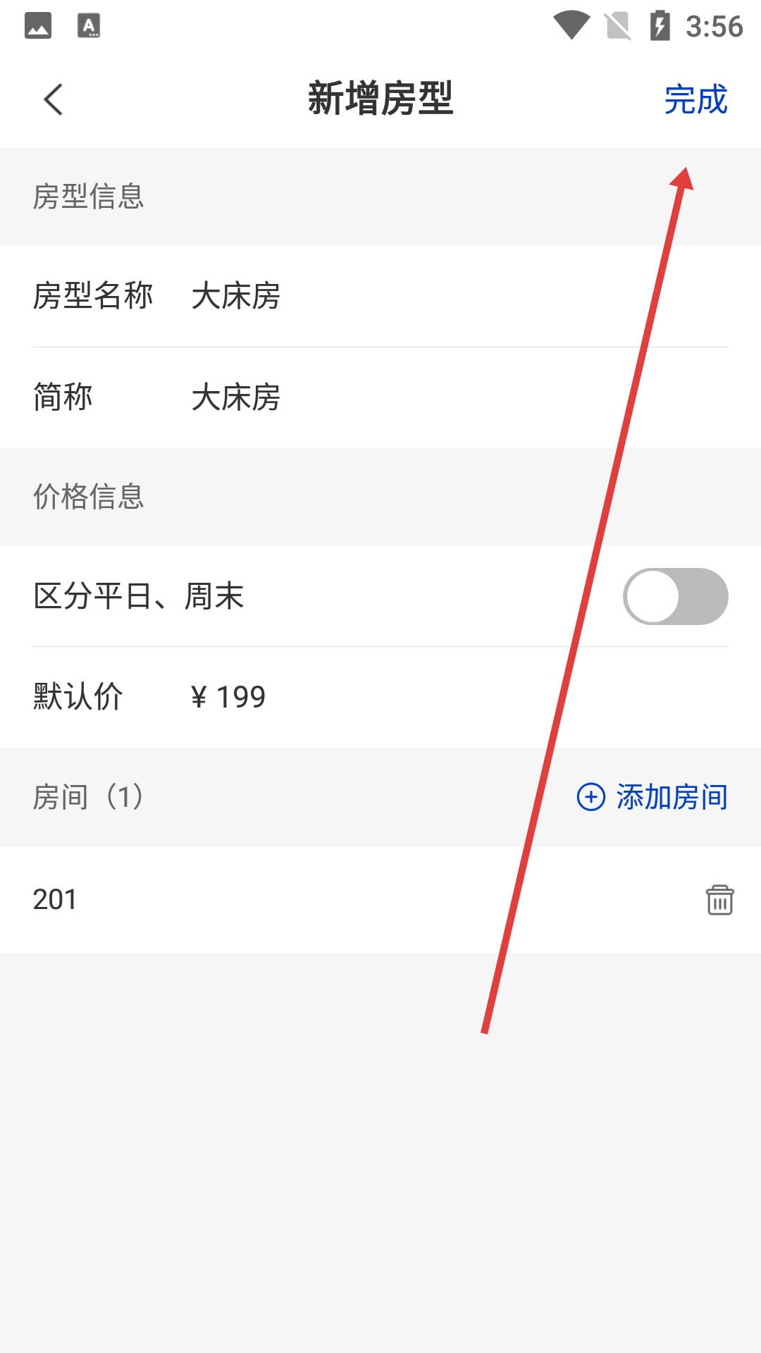4、依次填写【房型名称】【价格】【房间号】等相关信息,确认无误后点击【完成】按钮,即可完成房型的添加操作。