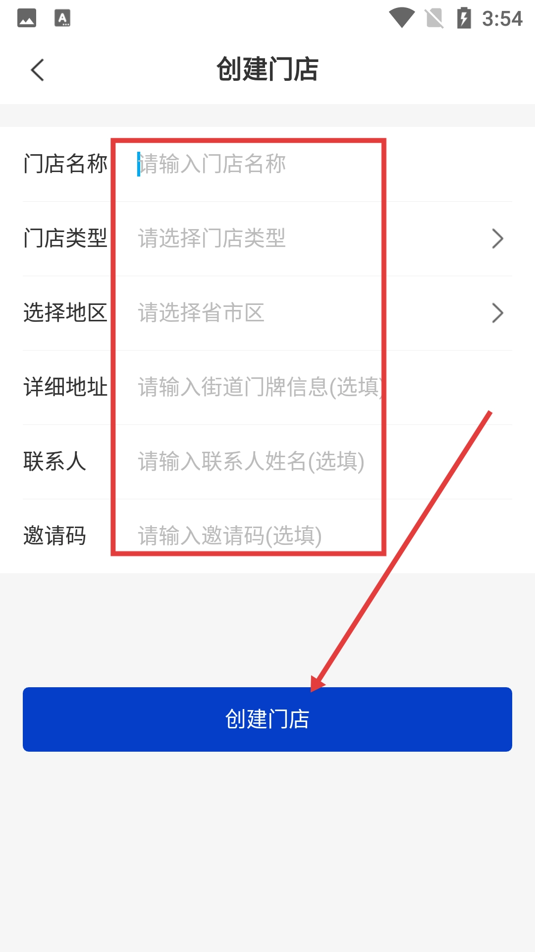 2、依次填写【门店名称】【门店类型】【选择地区】等相关信息,完成后点击【创建门店】按钮。