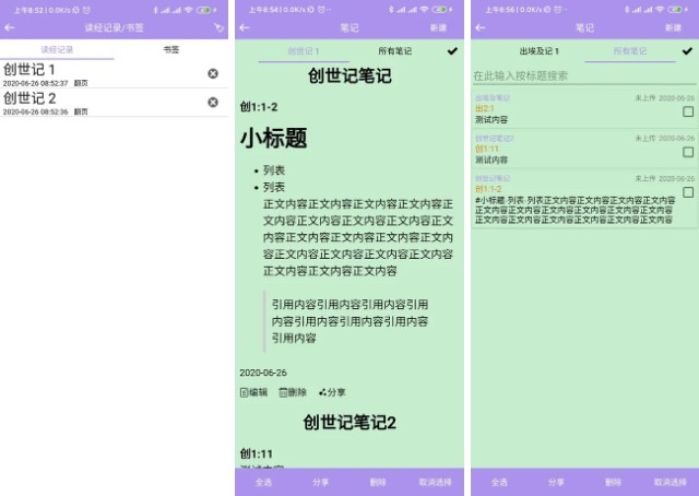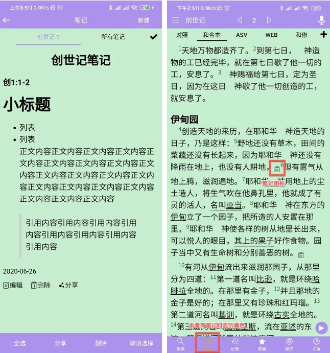 编辑多条笔记时,同一章的笔记会呈现在同一页,并依据关联经文的顺序排列。在【所有笔记】页面,能够查看全部笔记,该页面里的内容是按照添加时间排序的。