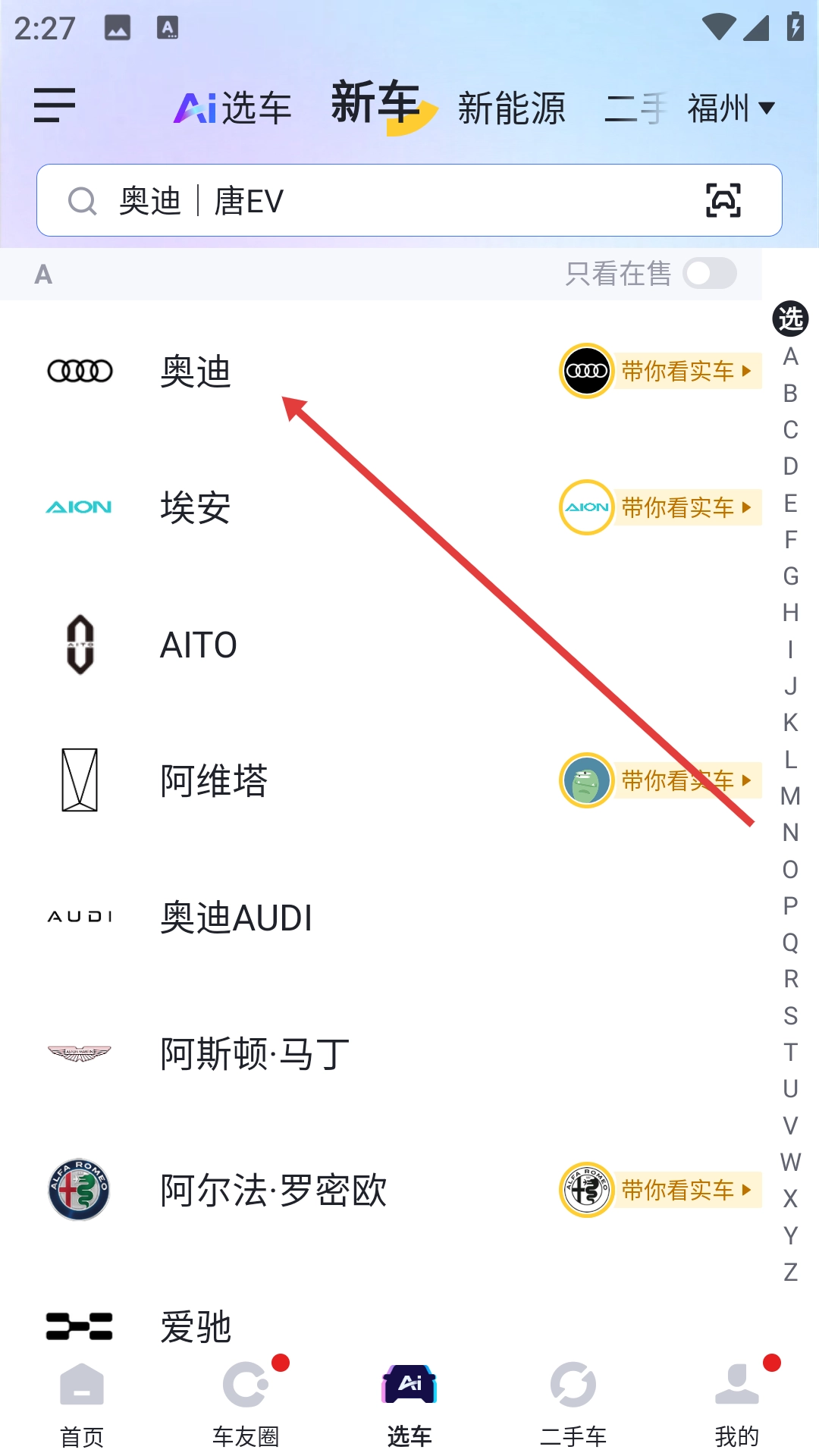2、在选车页面选择【奥迪】品牌,进入奥迪车型列表页面。