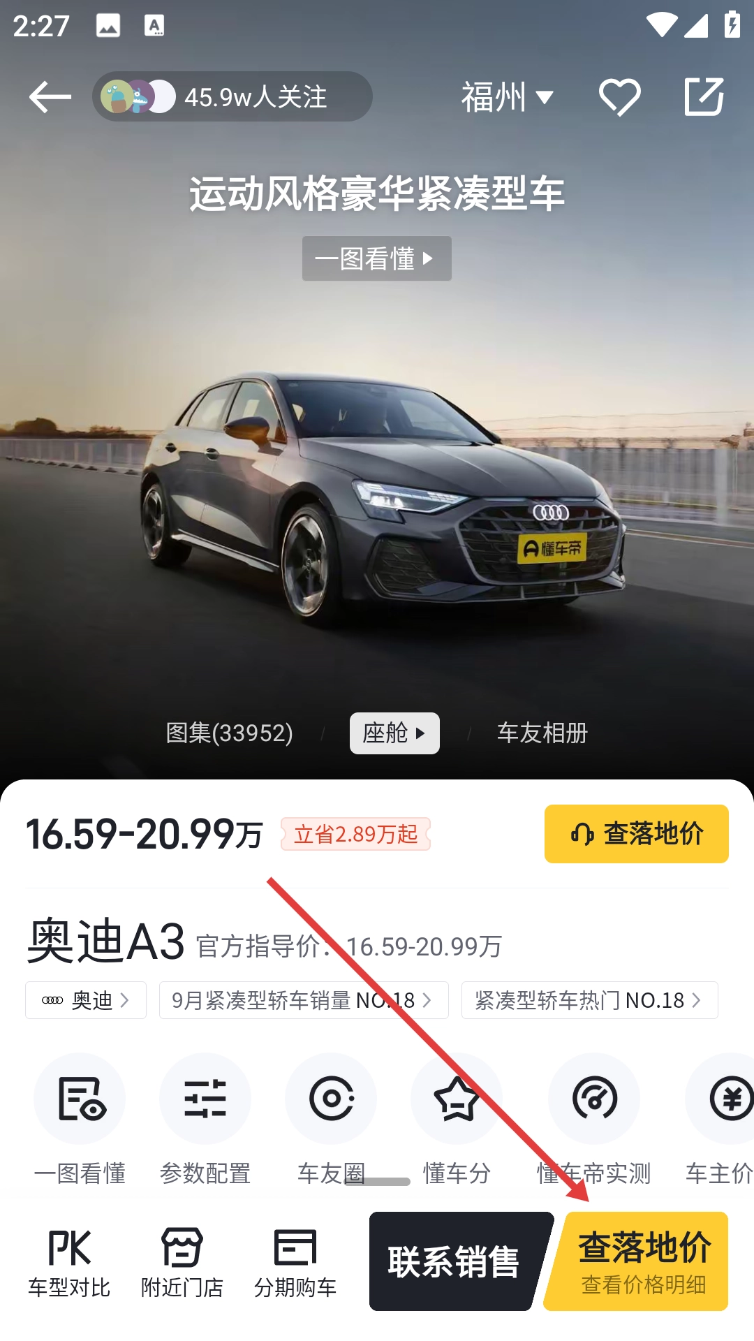 4、在奥迪A3详情页面点击【查落地价】,查看价格明细。