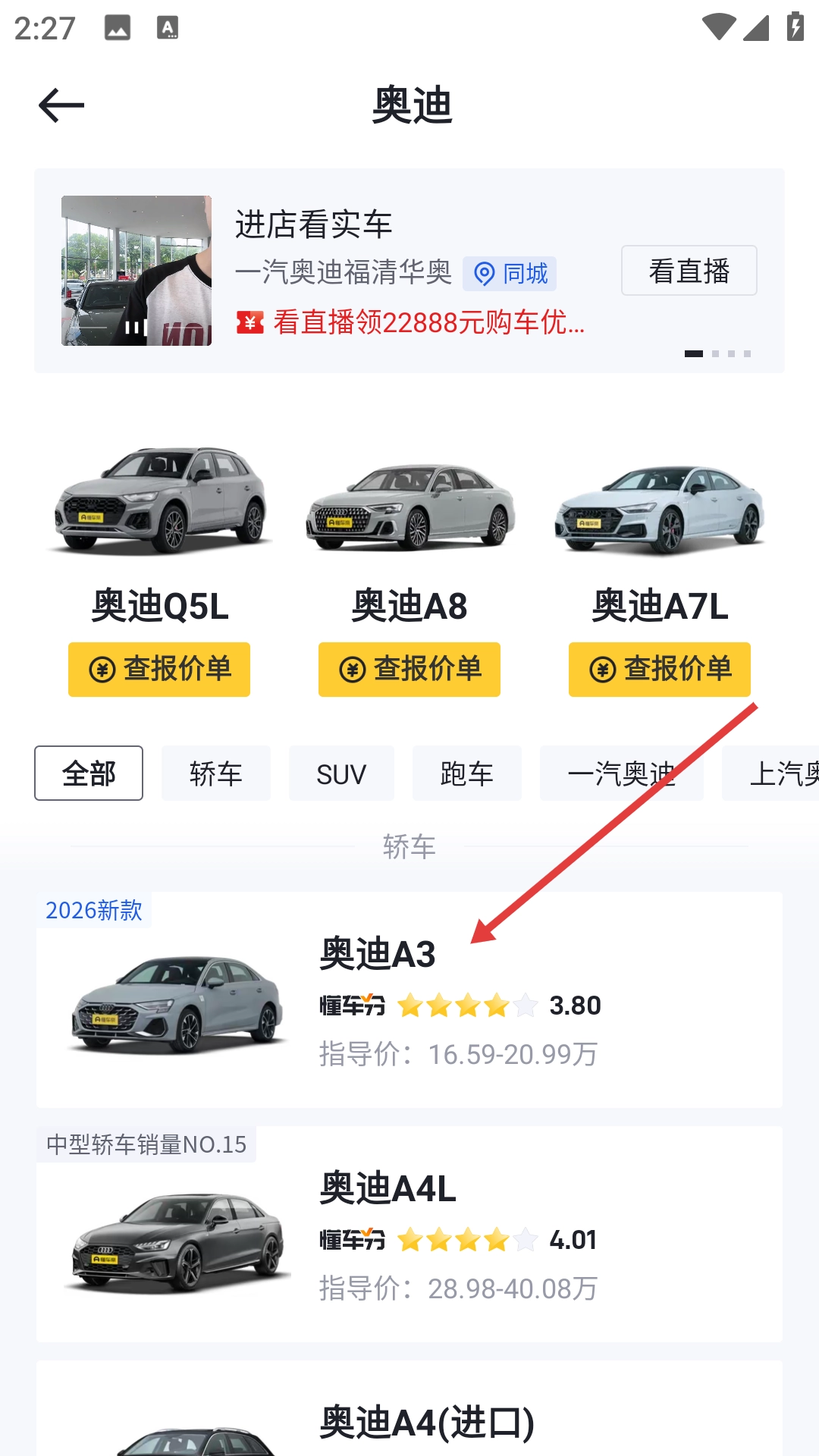 3、在奥迪车型列表页面点击【奥迪A3】,进入车型详情页面。
