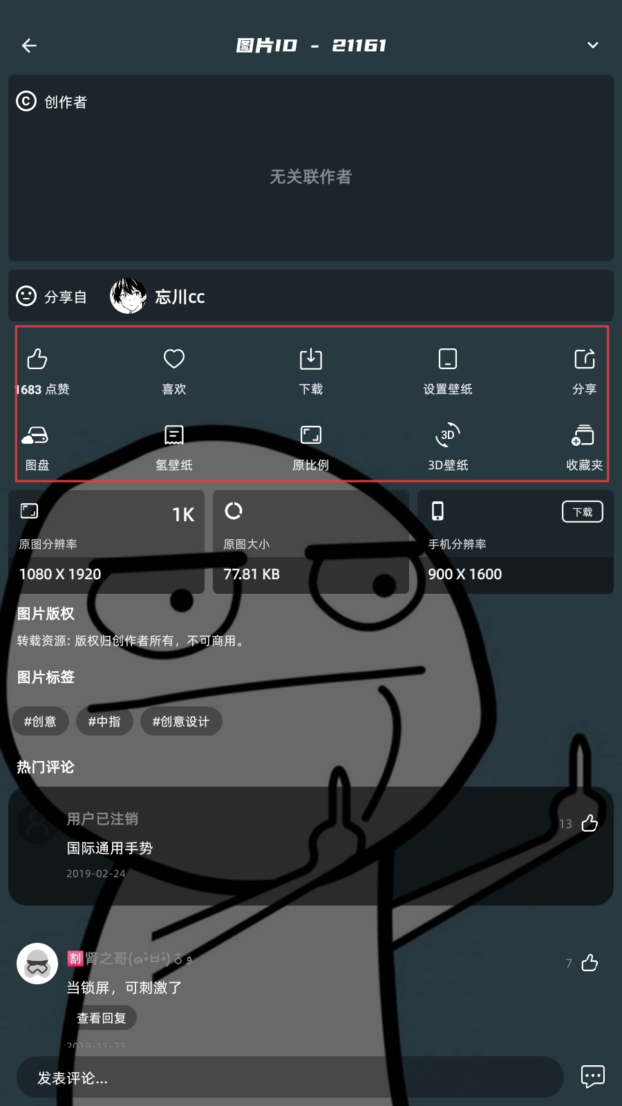 4、在图片详情页,可进行点赞、喜欢、、设置壁纸、分享等操作,如点击【设置壁纸-功能按钮】将图片设为壁纸。
