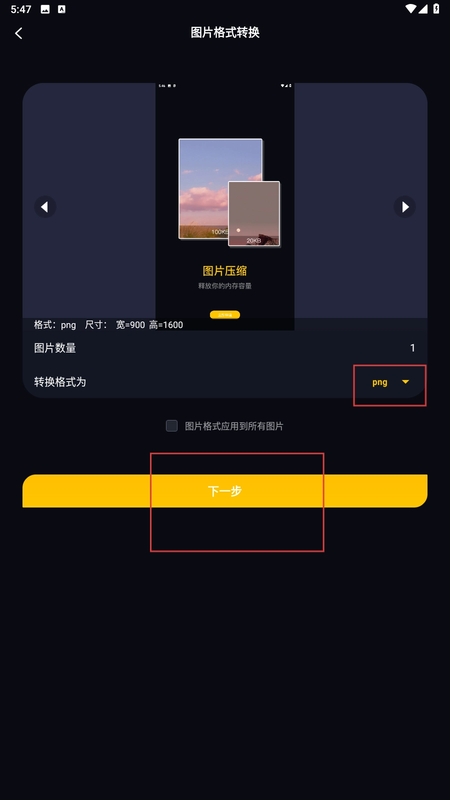 3、挑选好图片后,设置好转换的格式(例如png),接着点击【下一步-功能按钮】。