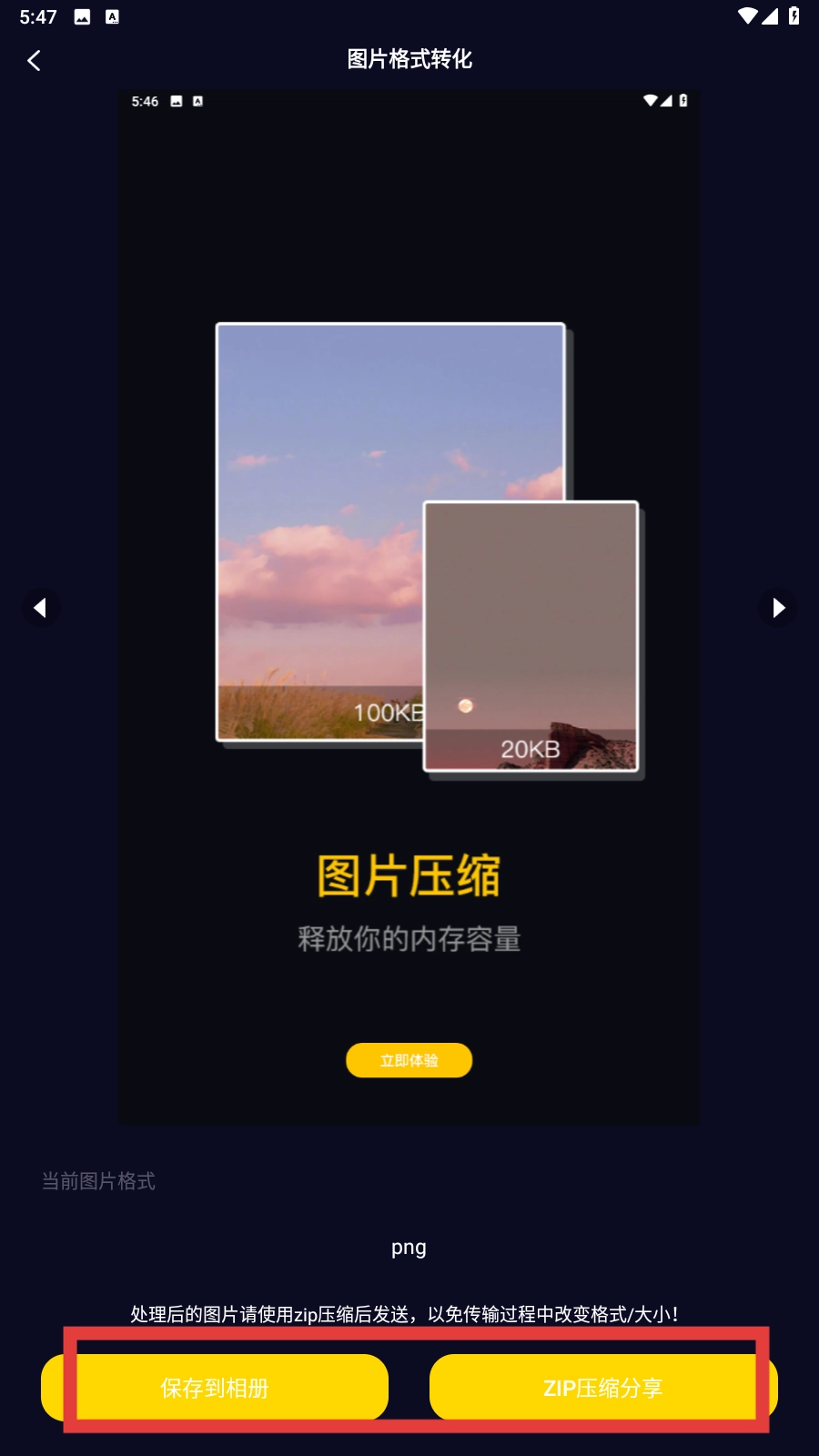 4、转换完成后,可选择【保存到相册】或【ZIP压缩分享】功能按钮,来完成图片格式转换后的后续操作。
