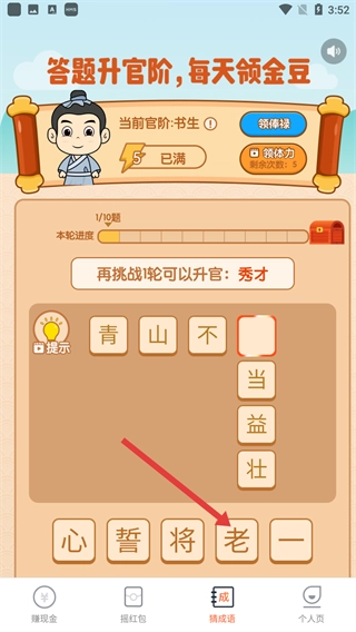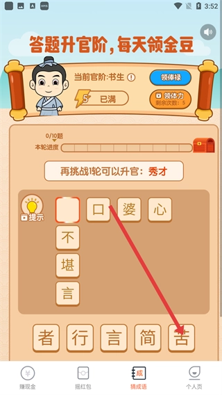 2、在猜成语答题界面,点击合适的汉字来组成正确的成语,进行答题挑战。