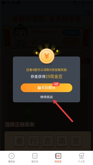 3、答题后出现奖励弹窗,点击【继续挑战】按钮,可继续参与猜成语答题。