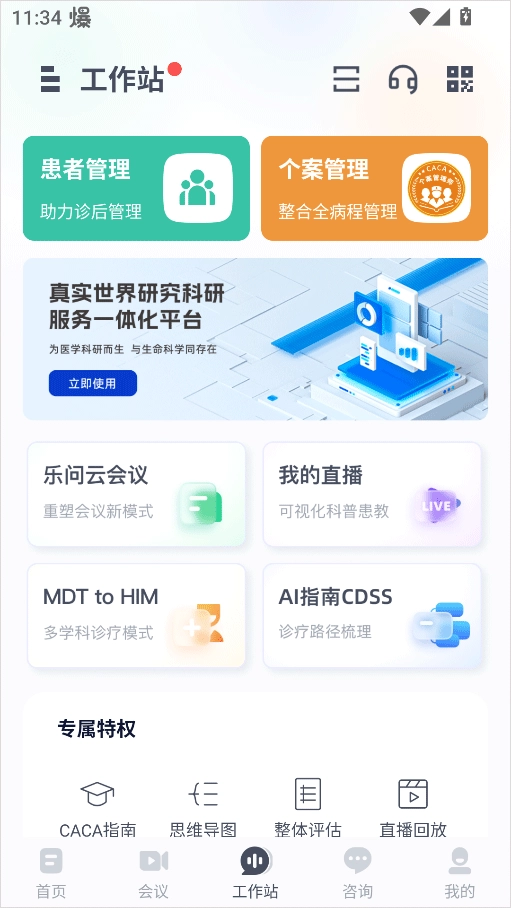 3、工作站功能:包含患者管理、个人档案、我的直播与专属特权。