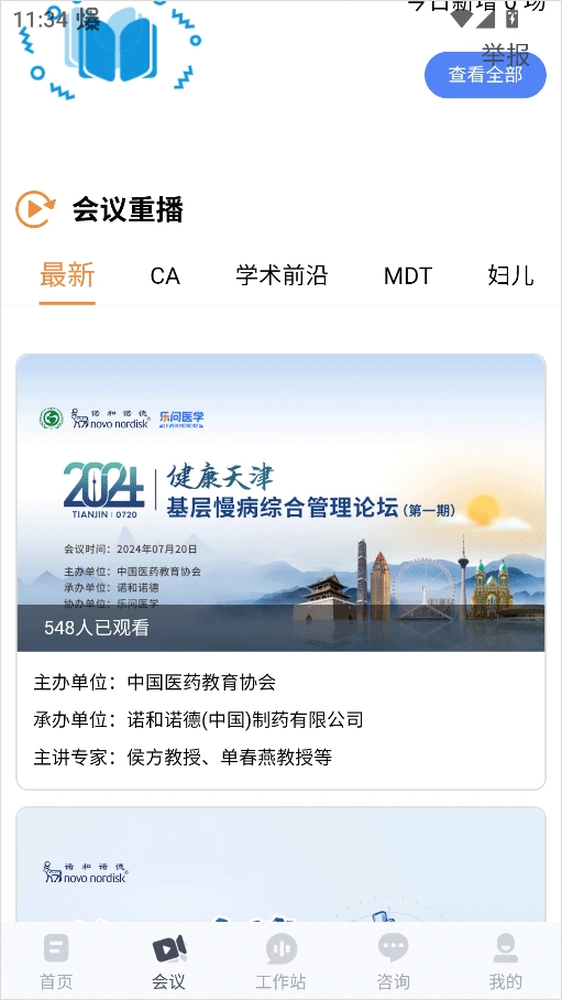 2、会议模块:查看学术会议列表、直播及预告,实时参与学术交流。
