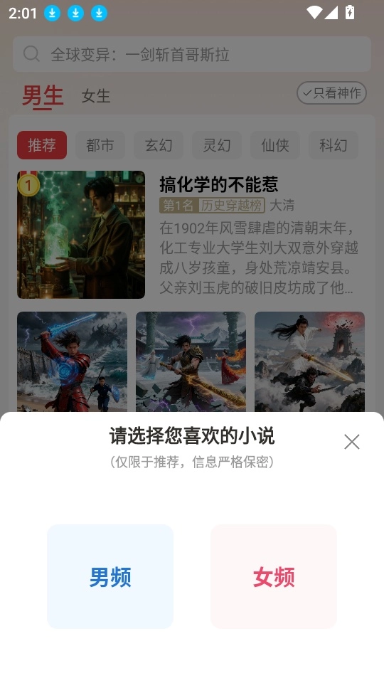 2、进入软件之后就可对下方弹窗中点击选择喜欢“频道类型”小说。
