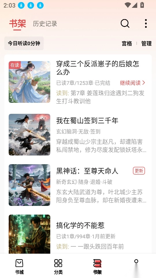 4、如此就可以看到自己书架中的小说,实时管理自己的小说。