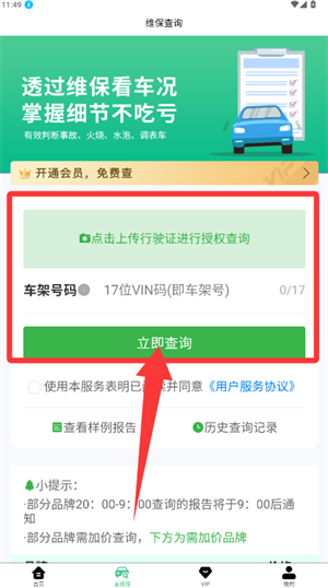 4、在维保查询页面,您可以上传行驶证照片或者手动填写车架号,之后点击“立即查询”按钮,即可获取对应的维保记录。