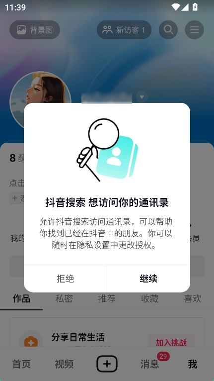 4、登录成功后会弹出抖音搜索想访问你的通讯录,这些可根据个人需求来选择。如果想让抖音给你推荐通迅录里的好友,那么就选择继续即可。