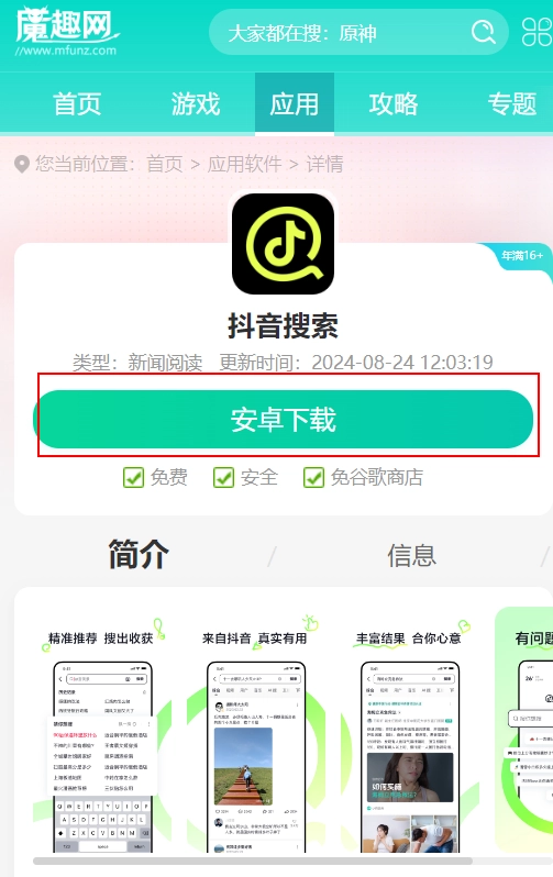 1、直接在魔趣网抖音搜索页面https://m.mfunz.com/soft/592.html,点击按钮,等待和安装完成。