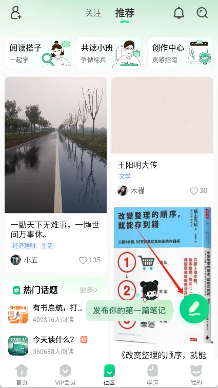 5、在社区页面您可以通过点击绿色的小铅笔头按钮来发布文章或投稿,分享阅读心得和想法。