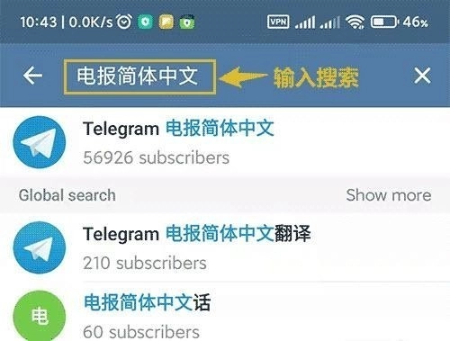 2、点击顶部的放大镜输入“电报简体中文”。