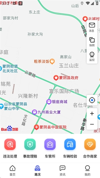 基于百度地图展示区域路况,可进行违法处理、事故理赔等车管业务操作。