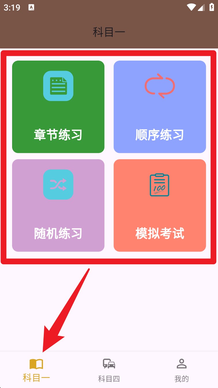 1. 打开应用程序进入主页面后,点击底部的「科目一」按钮,就能看到章节练习、顺序练习、随机练习和模拟考试这四个主要选项。