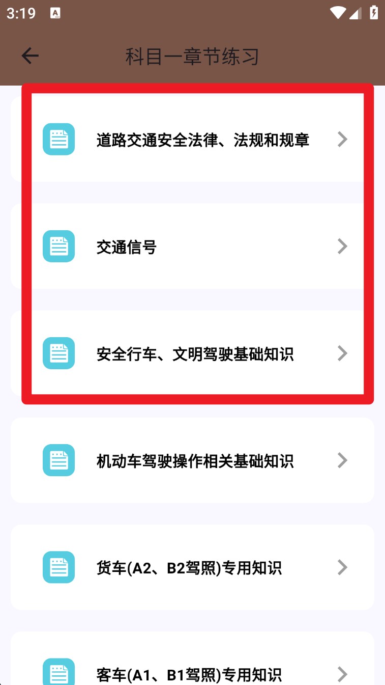 2. 选择「章节练习」进入后,能依据知识类别开展题目练习,像道路法规、交通信号、安全行车等方面的内容都包含在内。