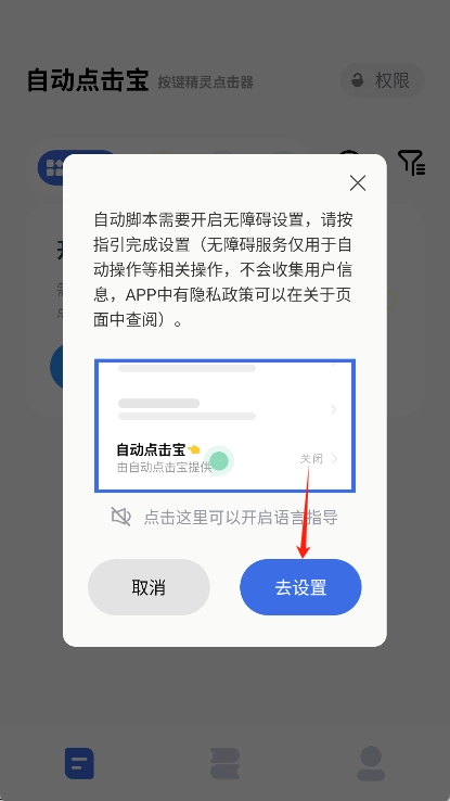 2、开启权限:进入首页后根据提示开启所需的权限,如悬浮窗权限、无障碍服务等。