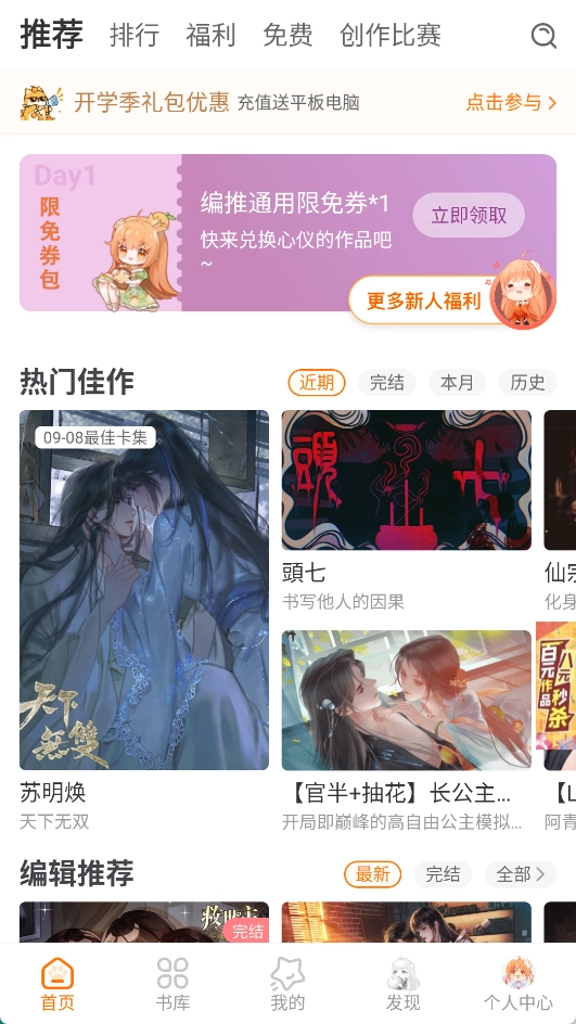 在首页,用户既可以借助主编推荐、类型分类等途径浏览作品,也能够利用搜索功能查找作品。