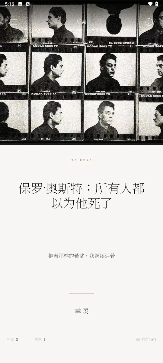 单读是一款相当出色的阅读应用。它为用户准备了海量的优质文章推荐,每天都会推送一篇值得深入品读的长篇内容,让用户能与作者展开一场思想层面的交流与碰撞。当下社会节奏飞快,人们常常容易在物质的追逐中变得浮躁。而单读始终专注于引导用户沉下心来,阅读更多有深度、有内涵的文字,以此滋养内心、丰富情感,从而实现精神世界的成长与提升。未来,单读也会持续探索,努力在当下的人群中发掘出如鲁迅、加缪、海明威般的思想者,用每一个独立灵魂的独特故事,共同搭建起属于我们这一代人的黄金时代。