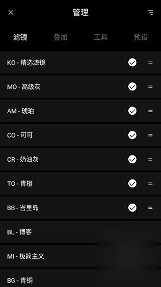 5、点击右下角的三按钮,可看到所有的滤镜以及一些工具;