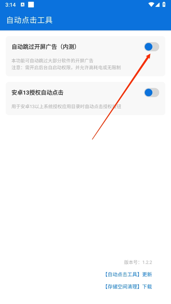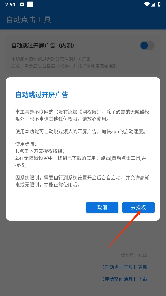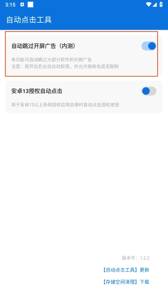 这款自动点击工具和李跳跳类似,不用联网就能用。它能根据手机系统自动跳过广告,只要开启无障碍服务,广告一弹出来就会立刻触发关闭操作,能帮用户减少误点广告的情况,而且还支持安卓13的自动点击授权呢!