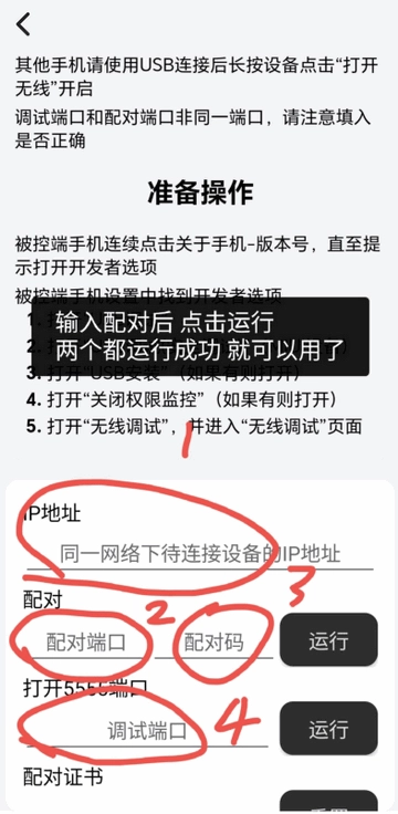 3、如图下图配对步骤,分别填入配对码、ip地址后点击"运行"。