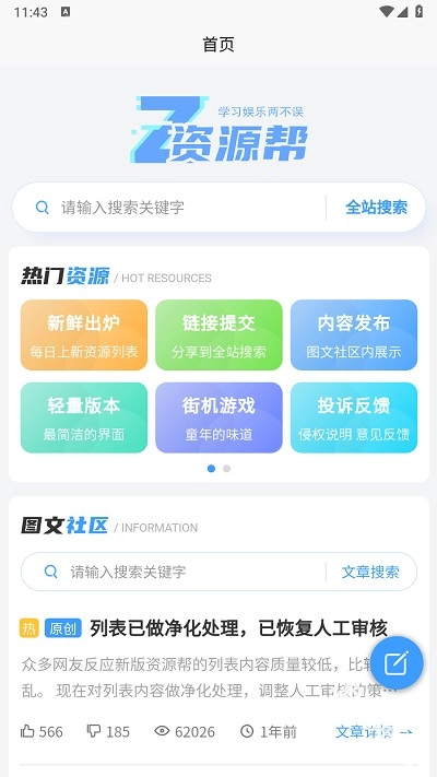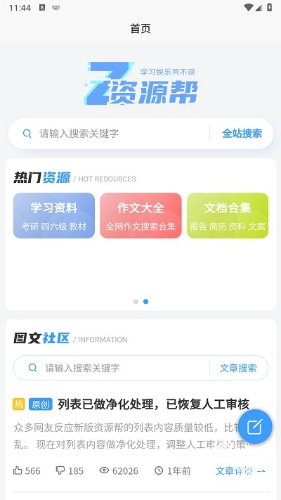 资源帮是一款资源类软件,海量丰富的资源,涵盖学习资料、作文大全等多种类型,供用户免费使用,是一款实用性极强的资源软件,各类资源一应俱全,能够满足用户多样化的使用需求。软件内设有活跃的社区板块,用户可在此浏览各类资讯。此外,软件操作简单易懂,新手用户也能快速找到所需资源,无论是学习资源还是应用游戏,都能轻松获取。