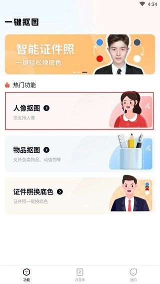 打开软件后,就可以按照自身需求进行功能选择了。这里以人像抠图功能为例,点击该选项即可进入操作界面。