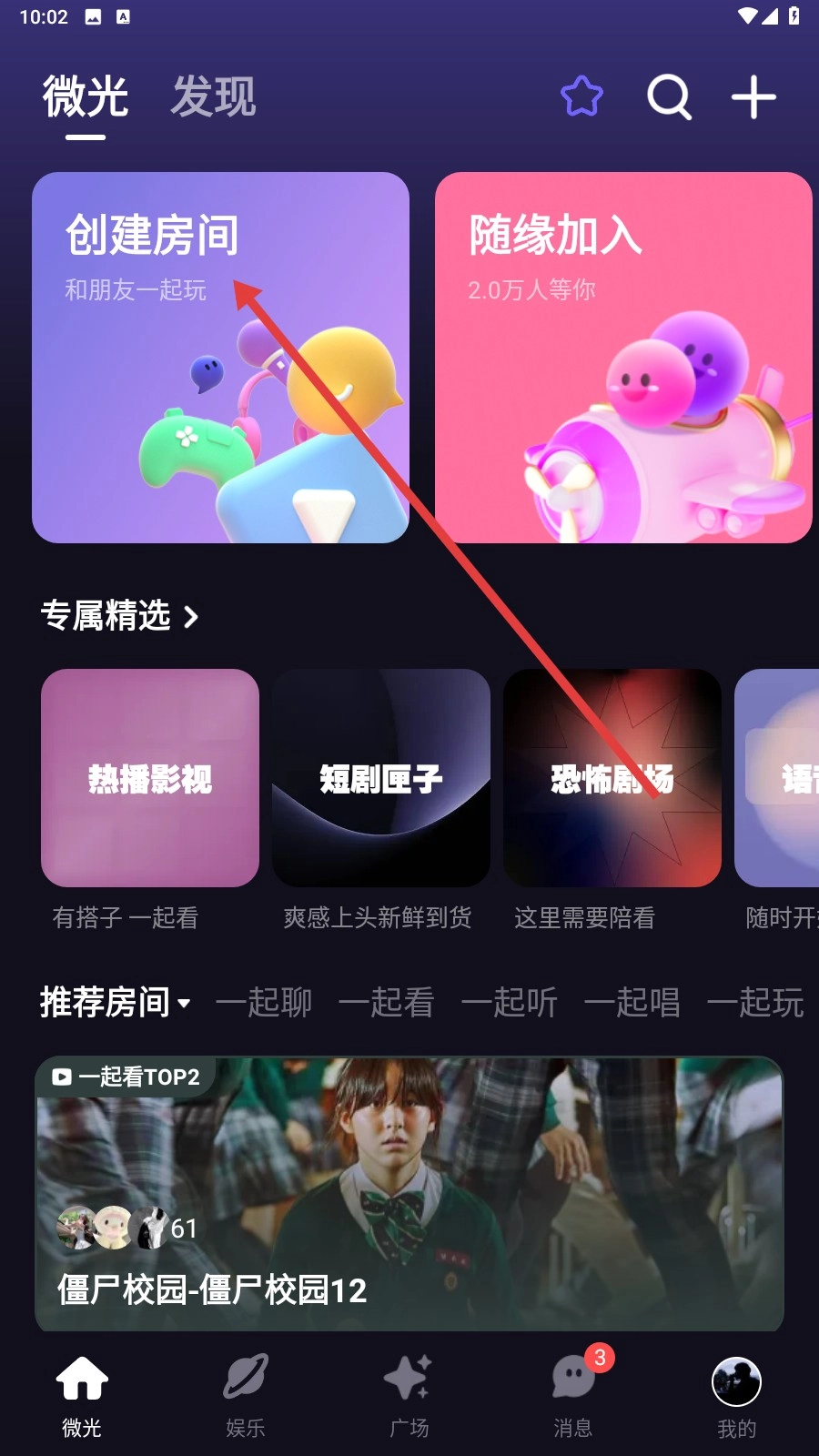 1、打开应用后,点击【创建房间】,就能开启与朋友互动的专属空间啦。
