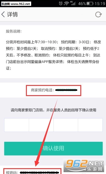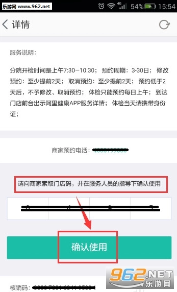点击屏幕中间位置的“商家预约电话”即可拨打预约服务,客服人员会和您核实屏幕下方显示的“核销码”信息以及您的身份信息。