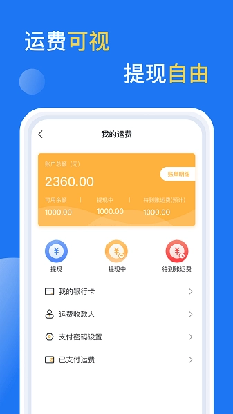 5. 账户管理:便捷查看账户相关信息,包括路线、钱包、运单违约等。