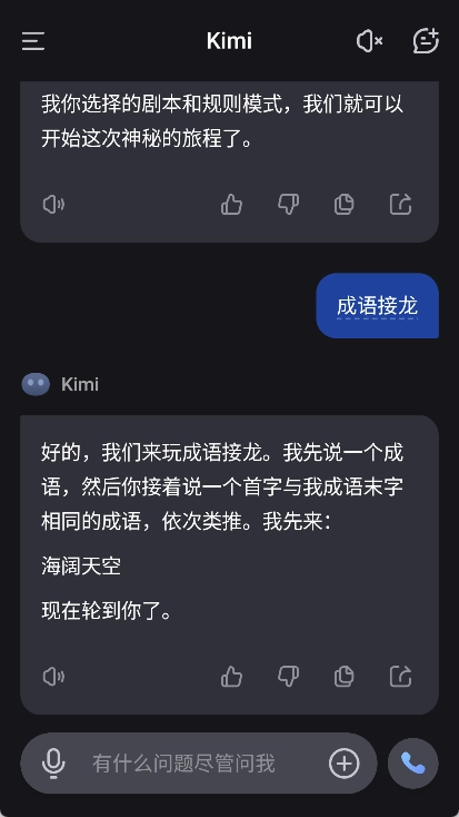 我们还能让Kimi设计一些有意思的互动小游戏,像成语接龙或者诗词对答这类的都可以。