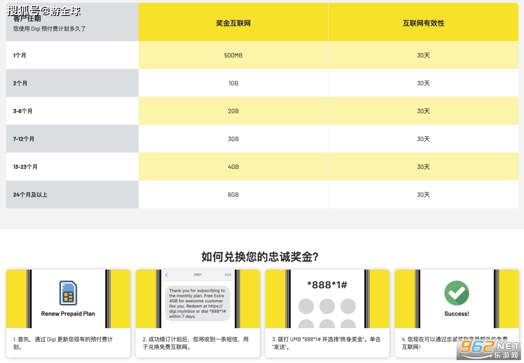 如果您是DIGI用户,且使用时长符合以下条件,就可以拨打*888*1#领取免费流量包,具体规则详见下图: