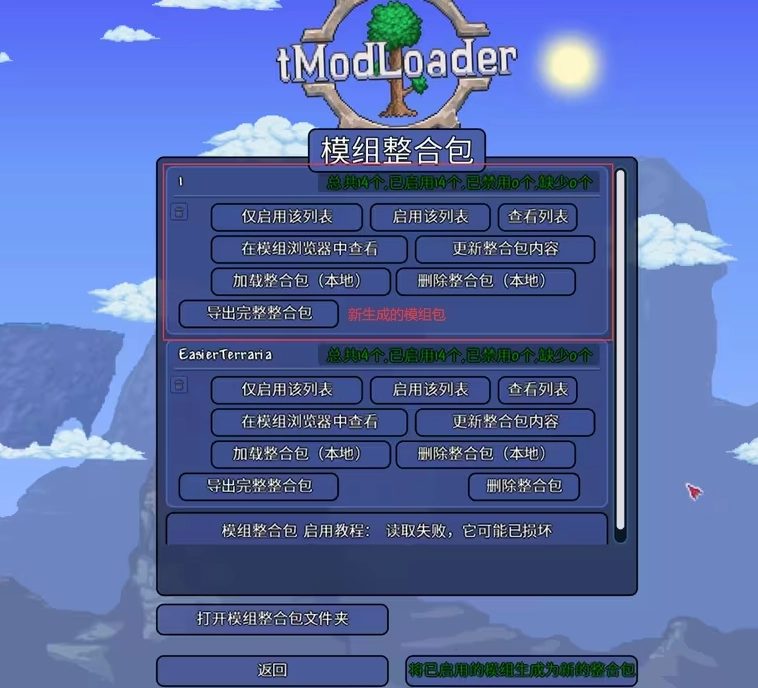 打开之前说过的导入位置(也就是Modpacks文件夹),新建一个文件夹——模组包在游戏里显示的名称由这个文件夹的名字决定,但其实名字也不是特别重要。把之前提到的ModConfigs和Mods这两个文件夹复制下来,放到刚创建的新文件夹里,这样导入就完成了。