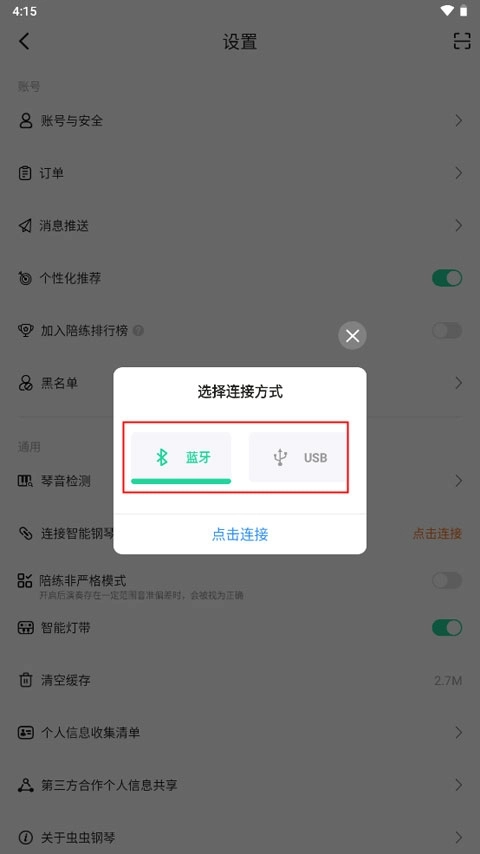 3、下面选择连接方式:蓝牙或USB,选择好后点击连接。