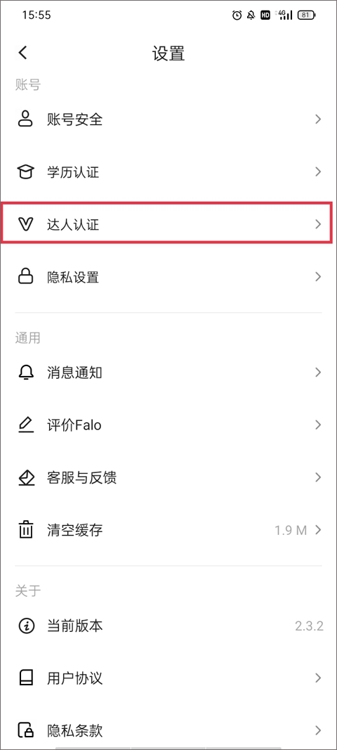 2、进入设置界面后,选择账号板块中的“达人认证”。