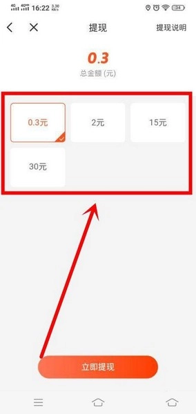 进入提现页面后,在页面里找到并选定提现金额,点击确认选中。