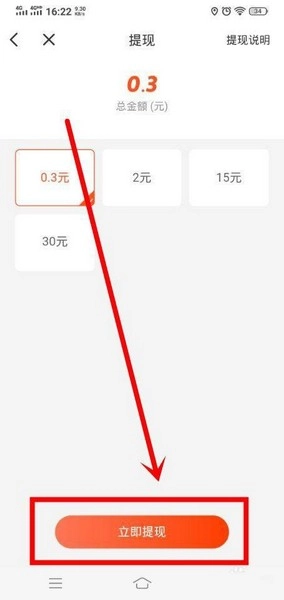 依旧是在提现这个页面里,在页面的正下方位置找到立即提现按钮,点击进入。
