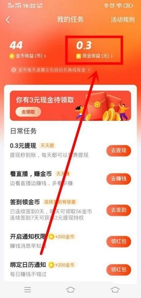 进入“我的任务”页面后,在页面右上方找到“现金收益”选项并点击进入。