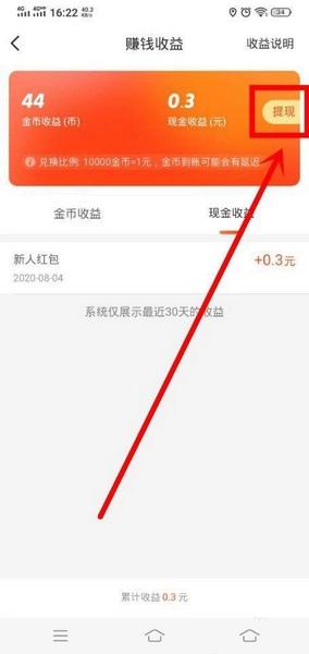 进入赚钱收益页面后,在页面右上方找到提现按钮并点击进入。