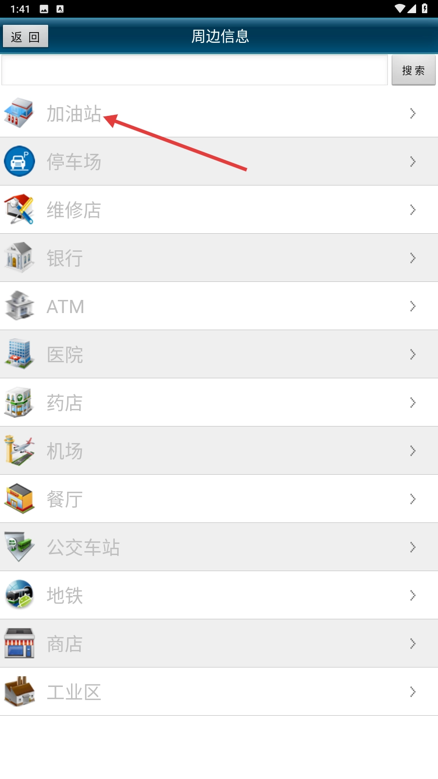 进入周边信息列表后,点击【加油站】选项,即可查看附近加油站的具体位置。