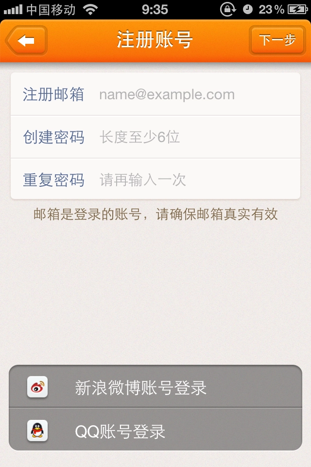 若您尚未拥有微博或QQ账号,需点击“注册”按钮申请新账号。进入注册界面后,仔细填写电子邮件、密码及重复密码,随后点击“下一步”进入“填写资料”界面。