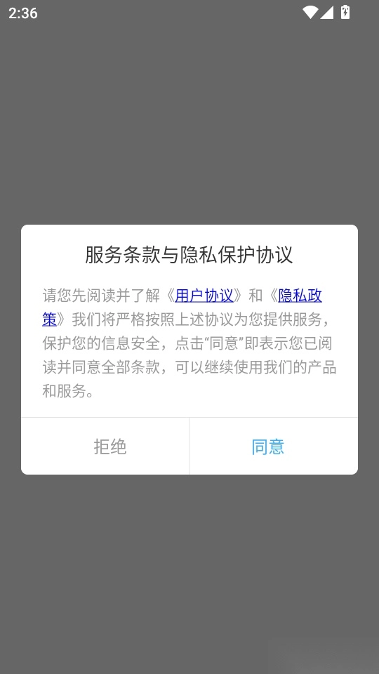 1. 首先打开软件,仔细阅读条款与隐私保护协议,确认无误后点击“同意”按钮进入下一步操作。